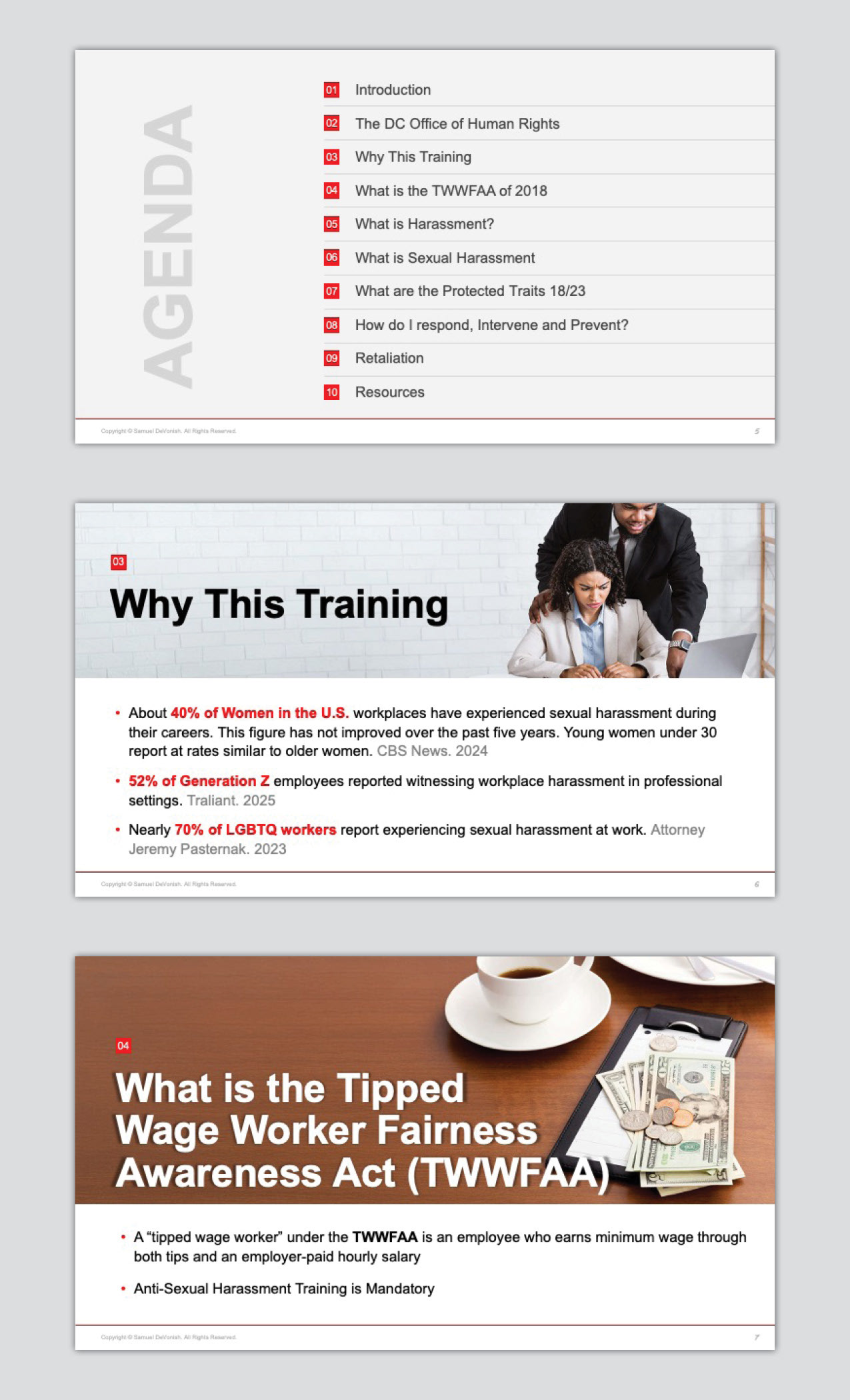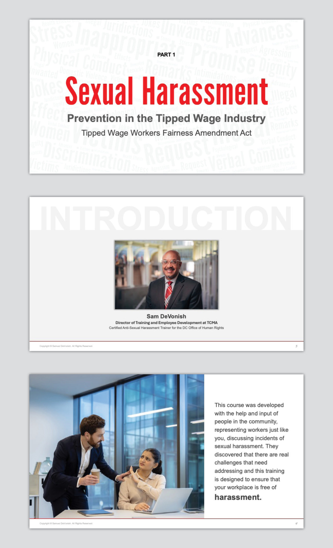 DESCRIPTION: Collaborated with Mr. DeVonish, an Anti-Sexual Harassment Trainer for the D.C. Office of Human Rights, to develop a comprehensive slide deck for his certified training: "Sexual Harassment: Prevention in the Tipped Wage Industry." The project included animation and an integrated voice-over to facilitate effective self-training.
