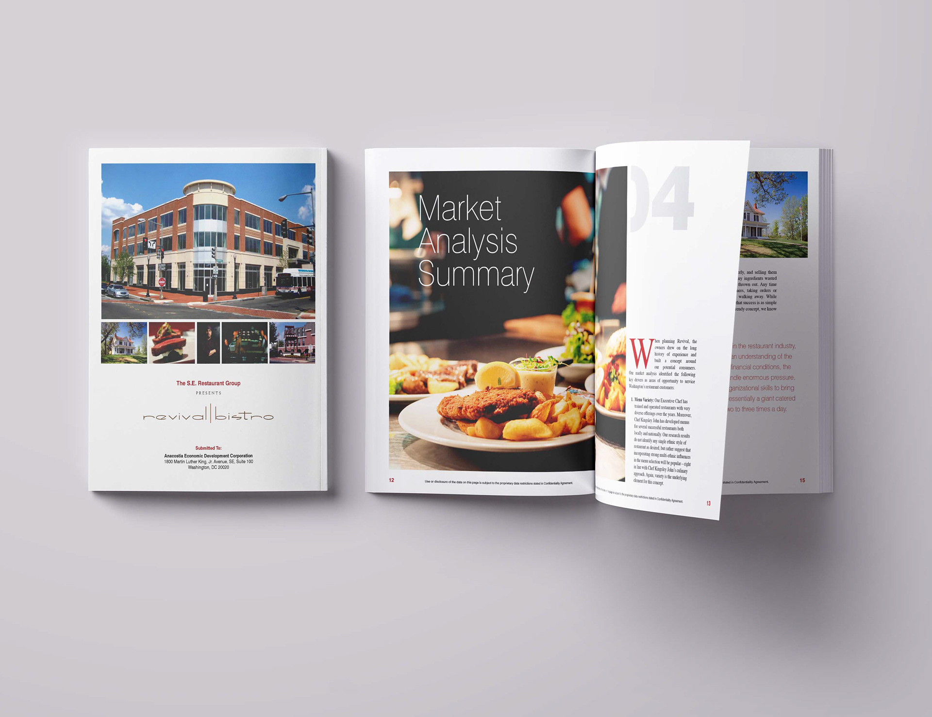 DESCRIPTION: Executed comprehensive design, layout, and formatting services for The S.E. Restaurant Group’s Revival Bistro Business Plan/Proposal, ensuring a professional and polished final document.